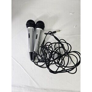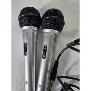 The product is a lot of two high-grade professional low-noise cable microphones in silver color. These microphones feature an on/off switch, making them convenient to use for karaoke performances. They can be used in a handheld or stand-held fashion, providing versatility for different performance styles. The sleek silver design adds a stylish touch to the microphones, making them a suitable choice for karaoke enthusiasts looking for reliable equipment.