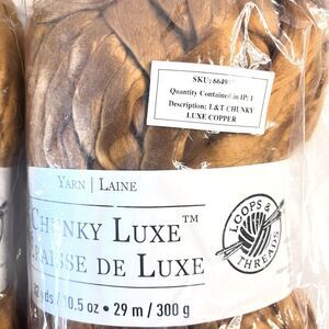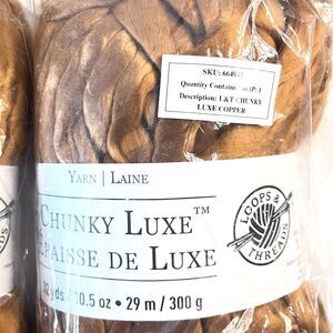 This product is a lot of 2 Loops & Threads Chunky Luxe Big Yarn rolls in the color copper. Each roll contains 32 yards of acrylic jumbo yarn, perfect for various crafting projects like crochet, accessories, scarves, crafts, and blankets/throws.