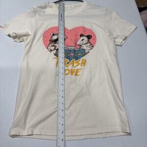 This product is a lot of 2 men's short sleeve graphic and solid tees in mustard yellow and beige colors, featuring a heart and animals character. The shirts have a crew neck and are made of a cotton blend material, with a knit fabric type. They are machine washable and suitable for all seasons, with a regular fit. The tees are ideal for men looking for comfortable and easy-care clothing options that can be styled for various occasions.