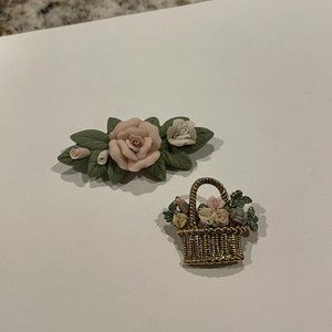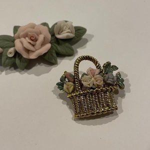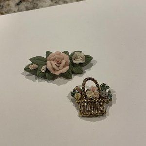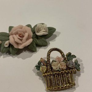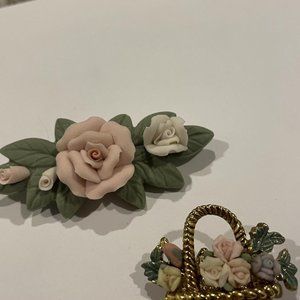 Lot Of 2 Porcelain Pink Flowers Gold Tone Brooch Pins - 1 MFA Museum Of Fine Art