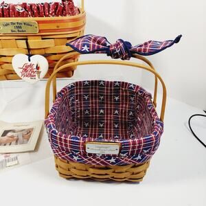 Woven Memories Basket with Dual Folding Handles Includes Americana Plaid Liner with Matching Handle Tie, Product Pamphlet & Plastic Protector. Initialed & Dated 2004 on bottom. Stamped Longaberger Handmade Baskets Est. Dresden Oh USA.