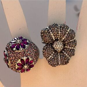 The first ring is a striking purple round rhinestone with flower design, sized at 6 3/4. The second ring is a flower-shaped, embellished with rhinestones, and sized at 6 1/2. Both pieces are costume jewelry, ideal for making a statement at special events or as unique accessories for everyday wear.