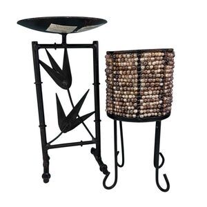 This lot includes two vintage-footed candle holders, each with a unique charm. One features a black metal bamboo-inspired design, 8 1/2”, offering a sleek and elegant aesthetic, while the other is a brown beaded tea light holder 6 3/4”, adding warmth and texture. Both are elevated on four sturdy feet, creating a stylish display for your candles. Perfect for adding a touch of vintage sophistication to any space.