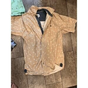 One Shirt Eight avenue New York Light Green. Size 11yourh Large 14 . Second Shirt Volcom Blue and white Size 14 , Large. Third shirt ‘ Distortion Light Brown Size 14 1/16 youth large All shirts are in good condition