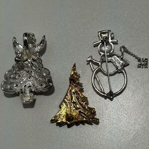 Lot Of 3 Christmas Theme Brooches Silver Gold-tone Angel Christmas Tree Snowman