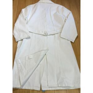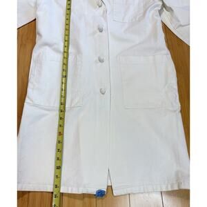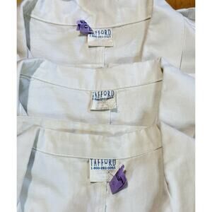 This product is a lot of three white Tafford lab coats in size 8, designed for women in the medical industry. Made of 100% cotton, these lab coats feature four front buttons, three pockets, and a button back tie closure. The length of the lab coats can be seen in the pictures provided. Produced in the United States, these Tafford lab coats offer a practical and professional option for those working in a medical setting.