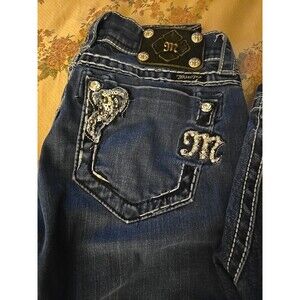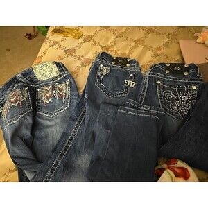 The product is a lot of three women's Miss Me jeans in size 25, featuring a skinny style with rhinestone accents. The jeans are a stylish shade of blue, perfect for adding a touch of flair to any outfit. Designed for a regular fit, these jeans are a fashionable choice for any woman looking to elevate her wardrobe with a trendy and versatile piece. See photos for exact style