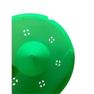 -Green bucket has cracked lid, significant flaws: stickers & residue, name written on bottom