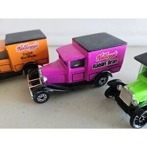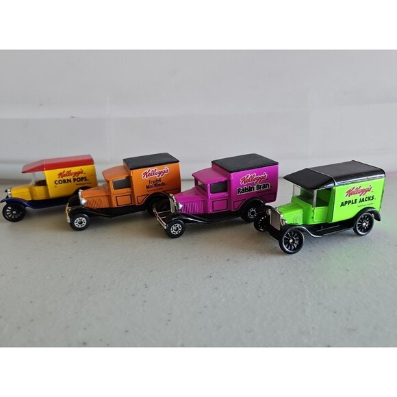 This lot of four vintage Matchbox International Collectible Kellogg's Cereal Trucks Corn Flakes set is a must-have for diecast collectors and vintage toy enthusiasts. These 1:64 scale Ford Model A&T Trucks are made of durable diecast material and come in green, purple, yellow, and orange colors, making them perfect for boys and girls of all ages.