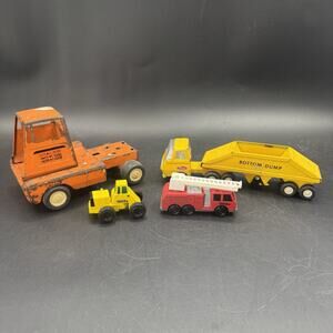 The product is a lot of 4 vintage metal Tonka trucks, including a fire truck, bottom dump truck, and tractor. These classic toy vehicles are made of durable metal and feature the iconic Tonka brand. Perfect for collectors or kids who love imaginative play, these vintage trucks are sure to bring hours of fun and nostalgia. Ideal for adding a retro touch to any toy collection, these Tonka trucks are a timeless piece of diecast toy vehicles history.