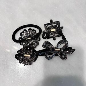 This set of 4 sparkly rhinestone-embellished ponytail holders features black elastic hair bands, and multi-shaped designs, including a diamond, bow, and flower. Each hair tie is crafted to add a touch of elegance and shine to your hairstyle, making them perfect for both casual and formal occasions. The rhinestones catch the light beautifully, enhancing your look with a subtle yet sophisticated sparkle. Durable and stylish, these hair ties offer both functionality and flair, keeping your hair securely in place while adding a decorative touch.