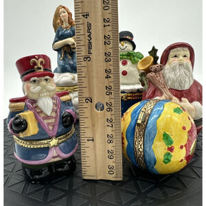 This lot of 5 Christmas-themed trinket, pill, and ring boxes features a festive Nutcracker design perfect for the holiday season. Made of ceramic, each box is adorned with a Christmas ornament and a music-themed charm. Ideal for collectors or those looking to add a touch of Christmas cheer to their home decor, these unique boxes are sure to bring joy and whimsy to any space. The large red Santa the box closes but does not hinge .