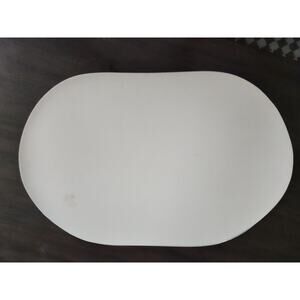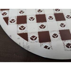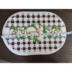 This is a set of six vintage vinyl placemats from Franco's featuring an oval shape and a white background with a mushroom pattern. The placemats are multipurpose and measure 12x18 inches. They are smooth and should be hand washed only. The placemats have a farm life and 80s theme and are not personalized.