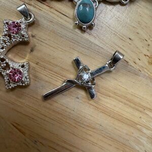 Feminine Pink Crystal Cross (bottom center):, crystal, rhinestone, silver-tone, ornate, and fashion jewelry.