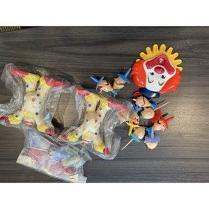 All items are sold as is. The clown face with the number does rotate. There is a picture of a wheel that goes around. Some of those clown heads are for candles. There are two clowns that might be used as part of a cake stand (but when in doubt dowel). I never used the fondant stencils- they looked really cool for scroll work. I actually have two of those pampered chef tart tappers . There are several unopened packages of cup cake liners, picks and even some that might work with the clown set up. Finally there is one bugs bunny who comes with two carrots. There probably more to this set, but I never saw them