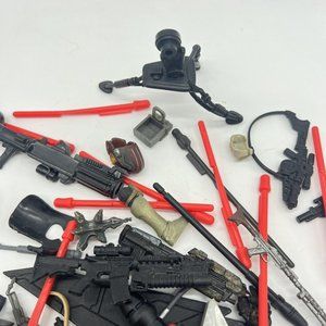This lot features a variety of accessories and weapons perfect for enhancing your collection of action figures. The colorful assortment includes items such as guns, ammo, and other military and adventure-themed toys. All pieces are original licensed reproductions made of durable plastic, and the collection includes vintage items from China.