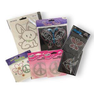 Add a touch of whimsy and sparkle to your fabric creations with this delightful collection of rhinestone iron-on designs. Featuring butterflies, bunnies, peace signs, and flowers, these versatile embellishments bring personality to clothing, bags, and crafts, letting your imagination take flight. A creative's treasure trove of shimmering possibilities. • Includes a variety of designs: butterflies, bunnies, peace signs, and flowers • Easy to apply with iron-on adhesive backing • Vibrant rhinestone details for added sparkle • Suitable for clothing, accessories, and craft projects • Multiple brand designs included for creative diversity Some packaging may show slight shelf wear, but all rhinestone designs are intact and unused.