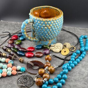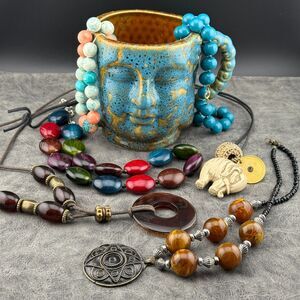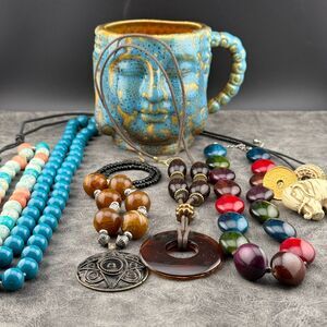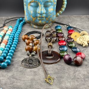 Lot Of Six Costume Jewelry Plastic Resin Necklaces Ceramic Buddha Mug Blue Brown