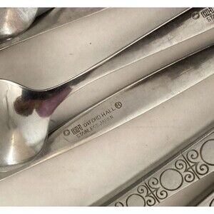 The product is a set of Oxford Hall stainless flatware, including 5 butter knives, 9 teaspoons, and 2 soup spoon. The set features a geometric handle pattern in silver and black, made of stainless steel. This discontinued collection was manufactured in Japan, adding a touch of elegance to any dining table. Perfect for those looking to add unique and high-quality flatware to their kitchen or dining space.