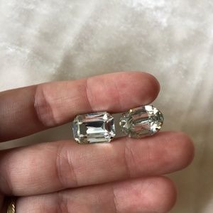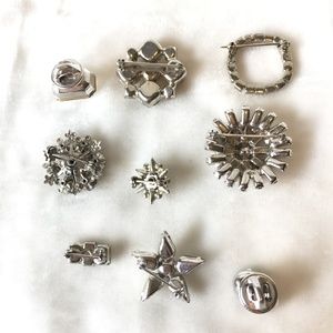 Style: A lot of clear rhinestone scatter pins. 9 pins total. 7 of them have safety catches and two are post pins with backs. They're all very pretty, in variety of shapes. One small three stone bar, one five pointed star, a small atomic shape, a rounded square, etc. Great details for a formal outfit or for a wedding.