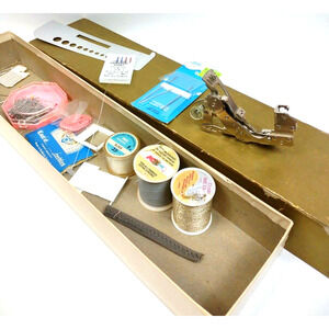 Vintage Box of Sewing Supplies - Greist Machine Ruffler Foot #2593519, Knitting Needle Gauge, Coat of Arms Needles, Thread