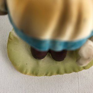 The other figurine is of a girl wearing a blue dress with apron. She is holding a basket of flowers near a wooden fence. She has brown shoes and brown hair, braided pigtails. This figurine is in good condition, with light crazing on the grass area.