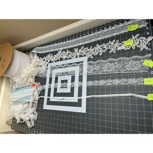 See photos for type and length. Lace is laid out on my 36” cutting mat