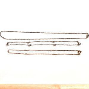 This lot includes: one pair of earrings, 7 necklaces which are chains only and 5 necklaces with a pendant or gemstone. Three of the necklace gemstones are clear, one is red and one is dark blue. The necklace and earring set is in a velvety case. All are vintage and are from the 1940s to the 1990s. Most of the necklaces have light wear. The case has aging and wear.