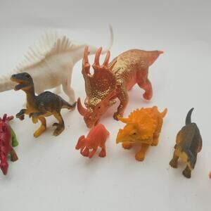 Bundle of 13 dinosaur figures—2 larger statement dinos (gold ceratopsian & white sail-back) plus 11 small assorted species in bright colors. Mixed brands; lightweight hard plastic perfect for imaginative play, classroom bins, sensory tables, party favors, cake toppers, or STEM/counting activities. Great add-on lot to expand a Jurassic playset or preschool toy rotation. Clean, smoke-free storage.