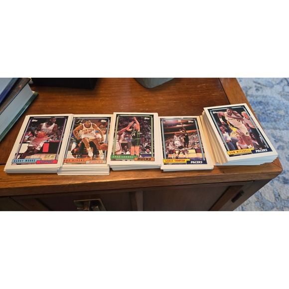 I have no idea what I've got here. So asking me questions probably will not help you. Buy at your own risk. There are about a hundred and fifty cards. A collection of 1992s Topps basketball cards showcasing prominent NBA players. This assortment includes cards from various sets and years within that decade, featuring a range of athletes who played during that era of professional basketball. Each card displays player photography and team affiliations.