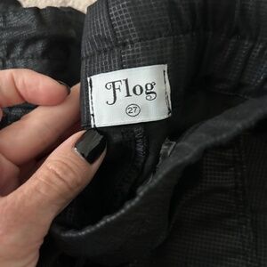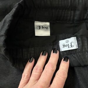 2 pairs of Bevy Flog jogger pants both size 27. I believe this style of Shely. I tried to get a picture of the pattern on each and it lightened the color but they are both dark black. One pair I did cut out the inner Bevy Flog label. Both were worn less than a handful of times. Washed on delicate (Tide Free) and line dried. I love them but I have too many pairs!