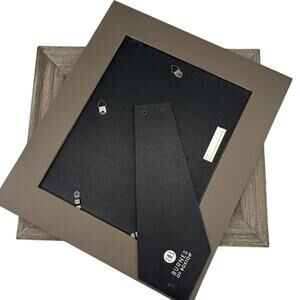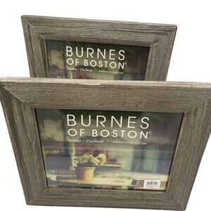 Selling a lot of two (2) new Burnes of Boston picture frames. The frames feature a rustic, weathered brown/gray wood look, perfect for a farmhouse or rustic decor style. Each frame holds an 8X10 photo or print. Includes an easel back for table display and hooks for wall mounting. New condition with original tags/labels attached.