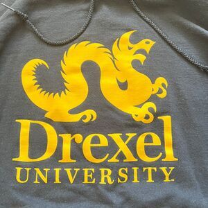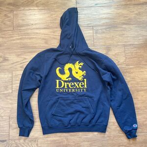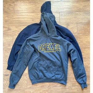 Lot of 2 Champion Drexel Hoodies/Hooded Sweatshirts Size M Unisex. Includes navy and gray. There is some pilling and discoloration of the sleeve on the navy hoodie. There is some wear to the logo and drawstring on the gray hoodie.