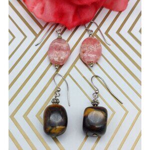 Lot of 2 Drop Dangle Natural Stone Pink & Tiger Eye Pierced Hook Earrings 1.25"