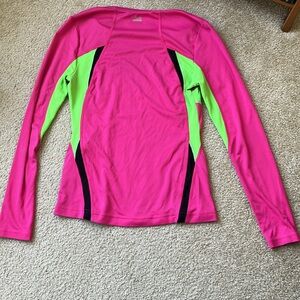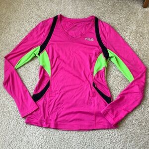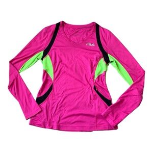 - FILA Women’s Sport Performance Pink Athletic Jogging Shirt, Size Small. Zip pocket, neon green and black accents. Good used condition here, with a few light stains and snags as shown in photos. Bust 33”/length 24”