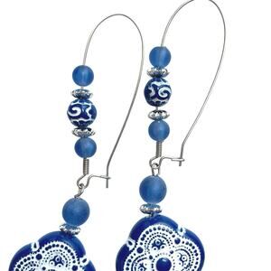 Features: Lot of two pairs; lightweight for comfortable wear; intricate raised patterns in cobalt blue and white; long dangle design; artisan-style construction; two distinct designs in matching color palette; secure fishhook and kidney-style ear wires; bold, artisan, and beautiful!