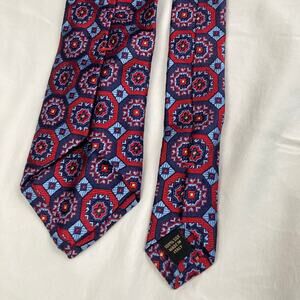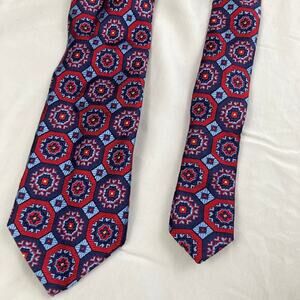 -red and blue unbranded tie: classic length and slim width in a heavy silk fabric with stained glass-inspired medallion print