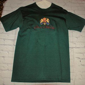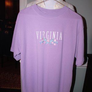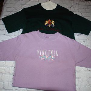 100 per cent Cotton, the green Williamsburg Crested Shirt is bit bigger than the purple but both say Large. The green shirt shirt has been washed once and hung up to dry.