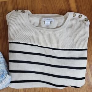 Beige & Black Striped Sweater – Features a timeless nautical stripe design with gold-tone button details on both shoulders. Lightweight and versatile