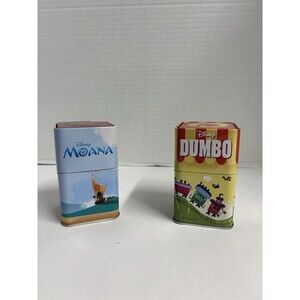 The product is a lot of 2 metal tin containers featuring designs of Moana and Dumbo. These decorative tins are made of tin and are not handmade. Perfect for collectors or as a cute addition to any decor, these tin containers are a fun way to add a touch of whimsy to any space.