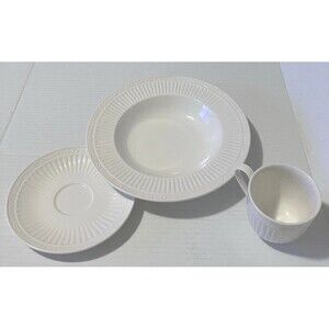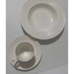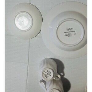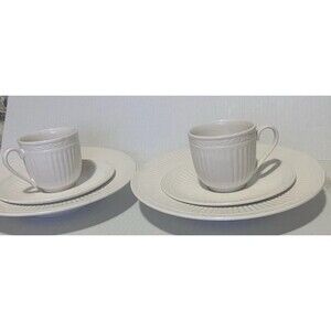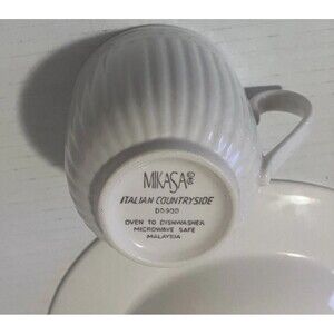 The Lot of 2 Mikasa Italian Countryside Cup & Saucer Set with two soup bowls is a vintage stoneware set featuring a round, cream-colored design with an Italian countryside theme. Signed by the Mikasa brand, this set includes two cups, two saucers, and two soup bowls, all made in Malaysia. The set is made with art pottery production style and studio craftsmanship techniques, adding a touch of elegance to your dining experience. Ideal for unisex adults, this original Italian Countryside collection exudes a charming charm that is sure to impress your guests at any table setting.