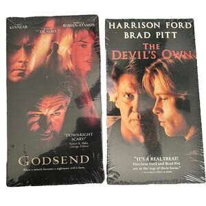 This listing is for two VHS tapes, featuring the movies "Godsend" and "The Devil's Own". The tapes are still sealed in their original packaging, making them perfect for collectors or fans of the thriller genre. The movies are rated PG-13 and are in black color. The tapes are in their original and authentic form and are suitable for anyone who loves horror movies.