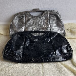 Lot of 2 Nicole Miller Faux Exotic Leather Clutch Kiss Lock Black/silver