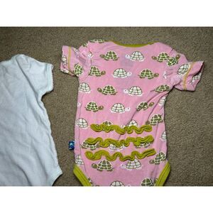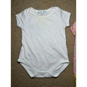Two sweet baby girl onesies. Pink with turtle print is Kickee Pants brand and is bamboo material. No stains or holes, but it is older. Magnolia Baby onesie is pima cotton. It has subtle light pink stripes and pink embroidered edging which gives it a classic elegant style. This onesie has moderate wash wear and yellow discoloration at neck line. Both washed in Dreft and coming from smoke free pet free home.