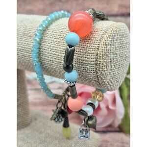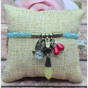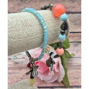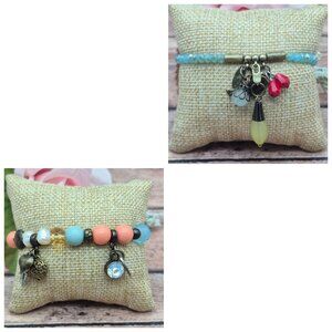 Lot of 2 PLUNDER Beaded Charm Bracelets Bird Heart Antique Gold Tone Boho Hippie
