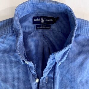 This lot of Men's Polo Ralph Lauren Blake Button Down Shirts are XXL in size. One features a solid blue plaid pattern, making it a versatile addition to any man's wardrobe. The yellow is a very pale yellow with pinstripe plaid details. Both made from cotton, these casual shirts have long sleeves, a button-down collar, and are machine washable for easy care. Part of the Ralph Lauren Polo product line, this classic and stylish shirt is perfect for everyday wear. Yellow shirt has a seam flaw, not a hole.