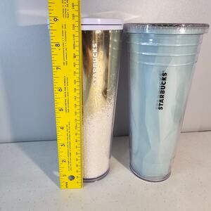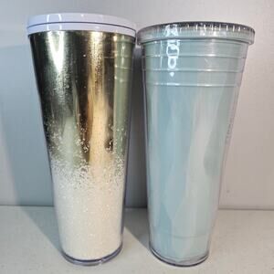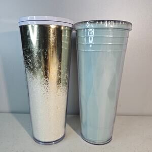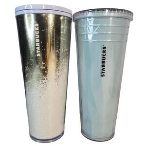 Lot of 2 Starbucks 24oz Tumbler Cups: 2019 Holiday LE Gold Confetti - 2012 Blue