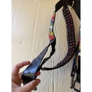studded belts with bold designs—one featuring colorful splatter paint studs and the other with red and black pyramid studs. Both show heavy wear and cracking but still make a great statement for punk, goth, or cosplay looks.