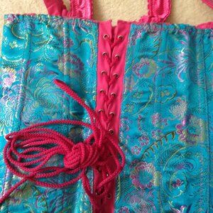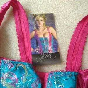 LOT OF 2 - TESA by Escante Corsets in Bra Size 32 (should also fit general top sizes XS/S). The back of both styles is lace up and the front has hook and eye closures. Excellent condition, tried on but never worn. The turquoise corset will include the original tag that is not attached. The black and red corset has been tried on and not worn either, but it is missing its interior size tag. Size 32 matches bra sizing guidelines and should fit XS or S in tops. You will get both corsets in this unique lot of 2!