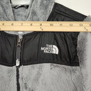 The product is a lot of two zippered jackets from The North Face for girls in size XL (18). One jacket is black and the other is gray, both made of 100% polyester fleece. These mid-length jackets have long sleeves, a zip closure, and a hood for added protection. They are machine washable and feature a regular fit, making them a comfortable and cozy choice for cold weather.